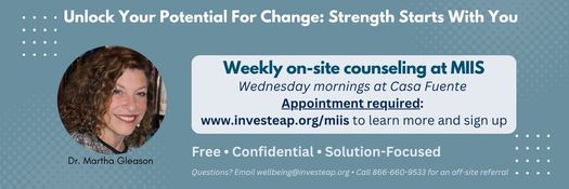 Our counselor is on-site every Wednesday morning at 8, 9, or 10 a.m. in the Casa Fuente building (room 437D). These solution-focused sessions are entirely free and confidential.